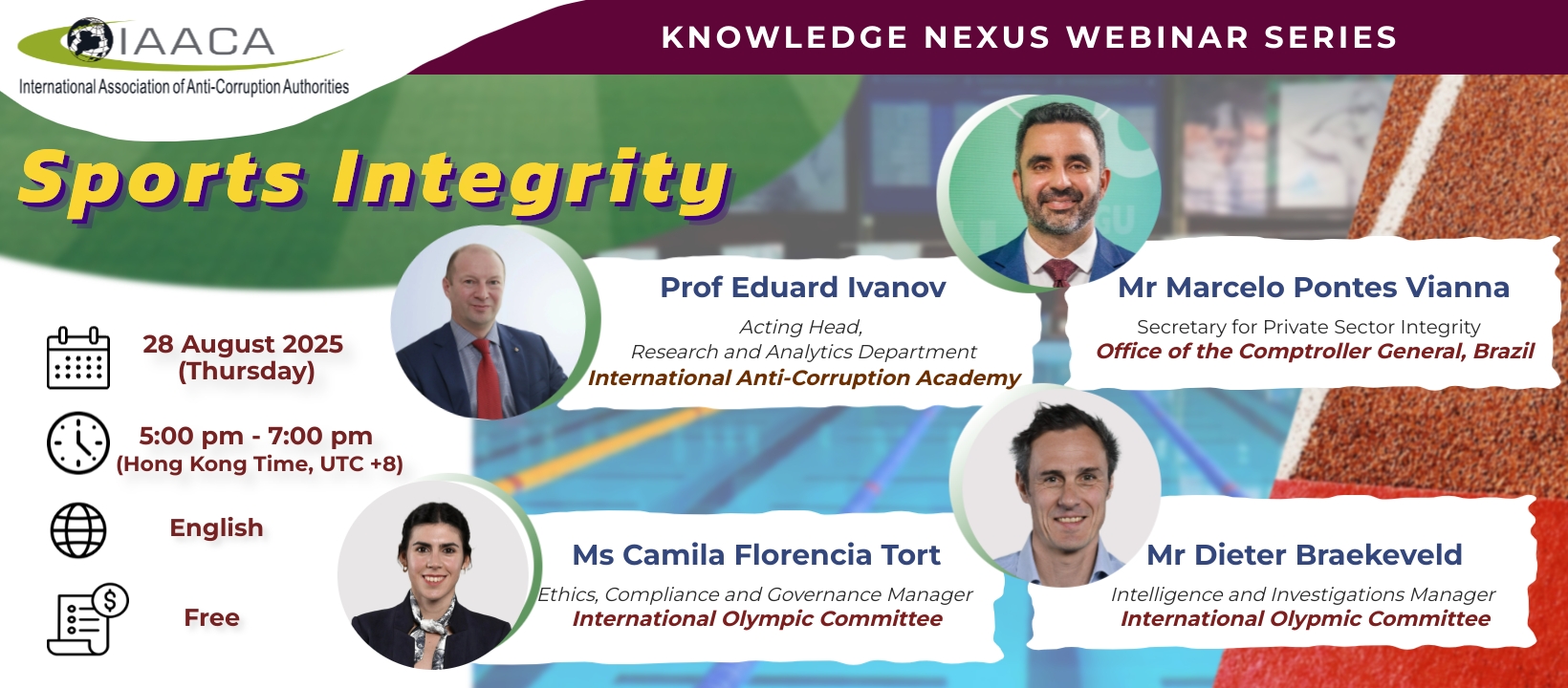 This webinar brings together distinguished speakers from the International Anti-Corruption Academy, the International Olympic Committee, and the Office of the Comptroller General, Brazil to address critical issues surrounding integrity in sports, including ethics, governance, corruption prevention measures, and the role of stakeholders in fostering a fair and transparent sporting environment.