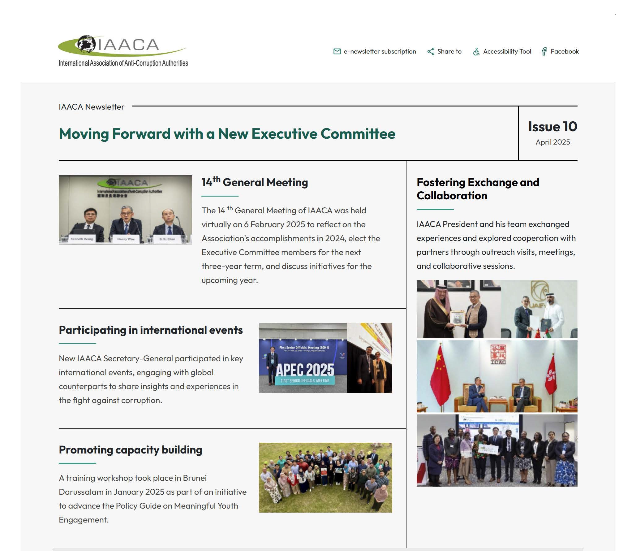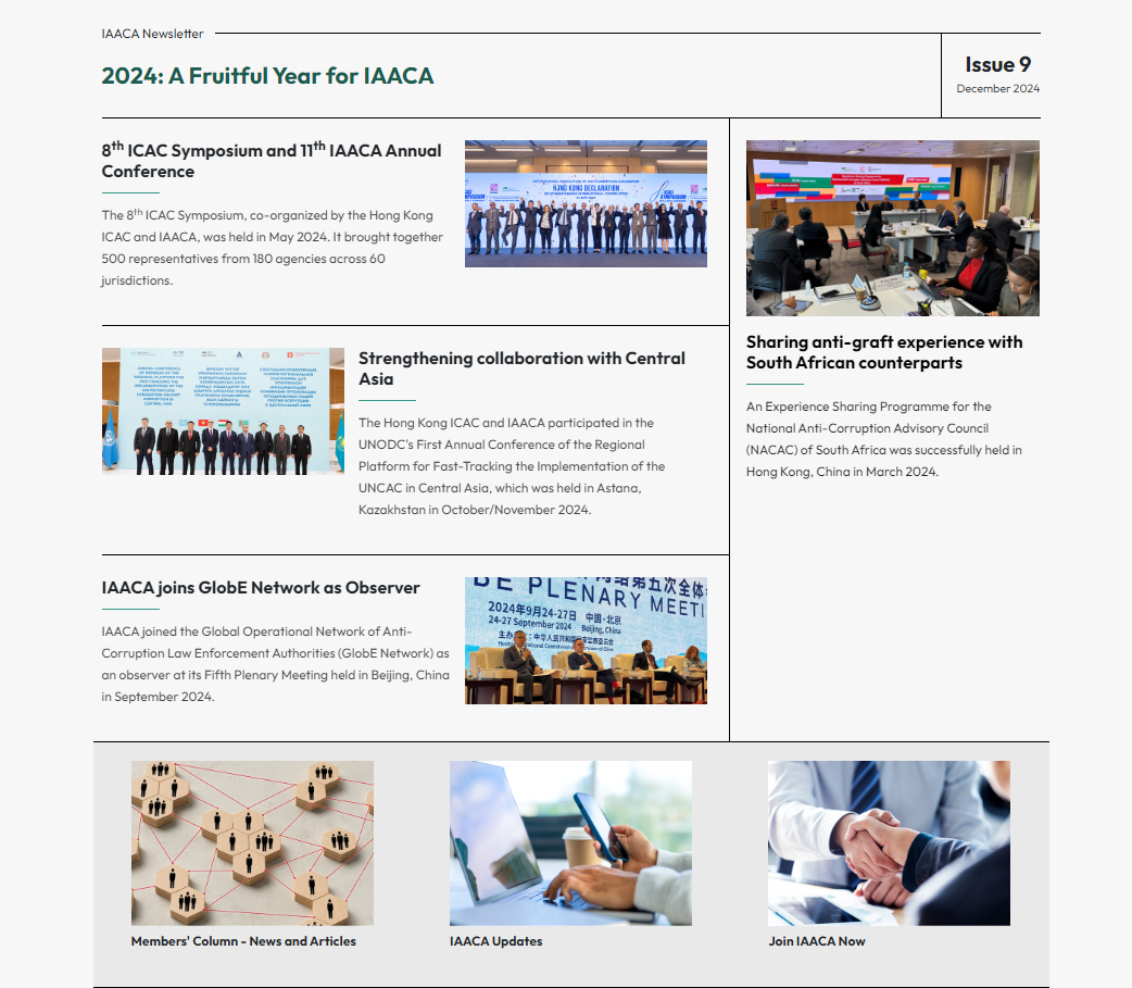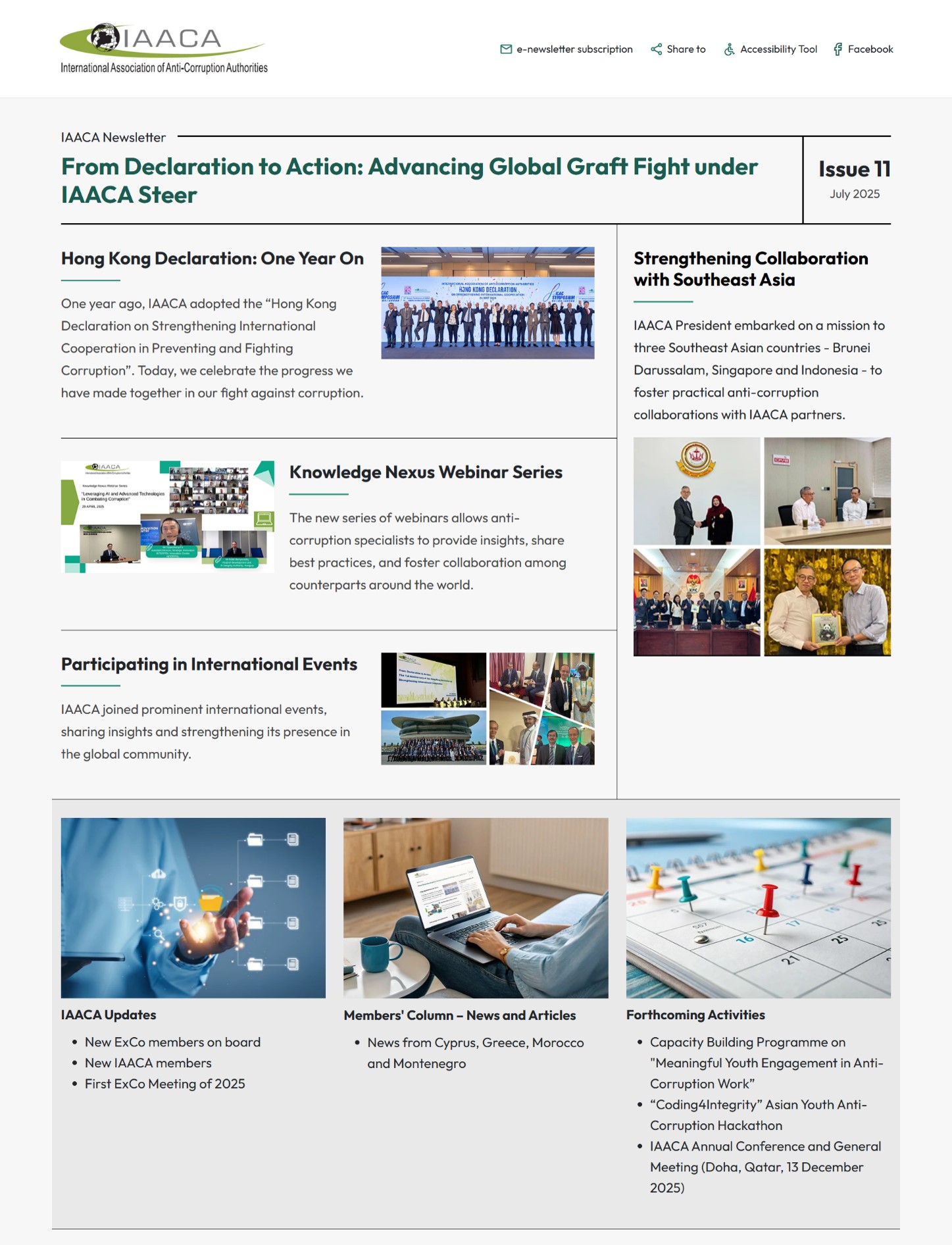 The IAACA Newsletter (Issue 11) is filled with updates and highlights, showcasing achievements under the Hong Kong Declaration, news and articles from our members, as well as a range of exchanges and training activities that have taken place since April 2025.