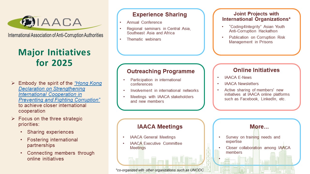 The Secretariat reported at the meeting IAACA's key achievements in 2024. In particular, IAACA co-hosted with the Hong Kong ICAC the 8th ICAC Symposium and IAACA 11th Annual Conference in Hong Kong in May 2024, during which the "Hong Kong Declaration on Strengthening International Cooperation in Preventing and Fighting Corruption" was adopted. The Association also organized training events for anti-corruption counterparts to share experiences, and strengthened connections with global partners. A summary of these initiatives can be found here F[link]